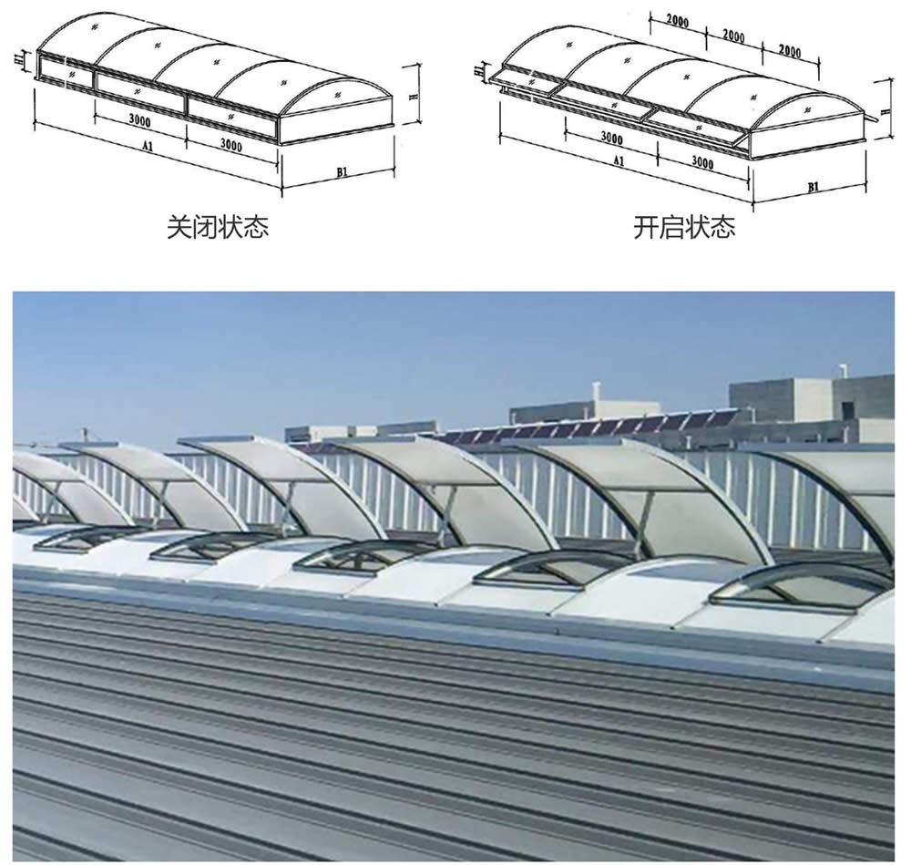 圆拱型电动消防采光排烟天窗:适用于北方多雪天气,造型美观的同时,更多的兼顾了积雪重压的高荷载情况,再配合电热融雪装置,让屋顶的积雪不再成为问题。